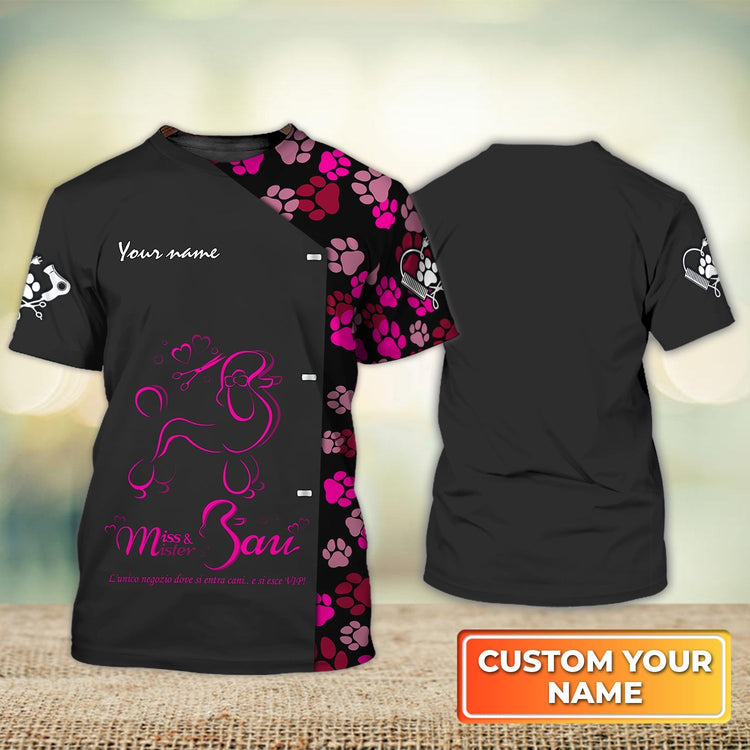 Custom 3D Miss And Mister Sau Pink Bow Poodle Dog Groomer T Shirt Pet Groomer Uniform Salon Shirts