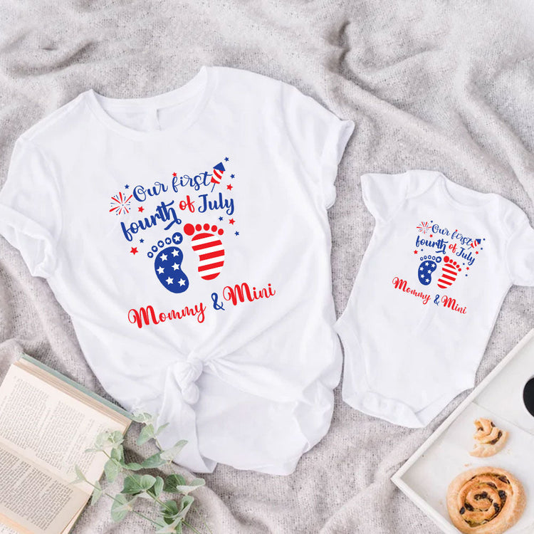 Personalized First Independent Day Matching Outfit For Mom And Baby Footprint Custom Name, 4th Of July Matching Outfit For Mom And Me