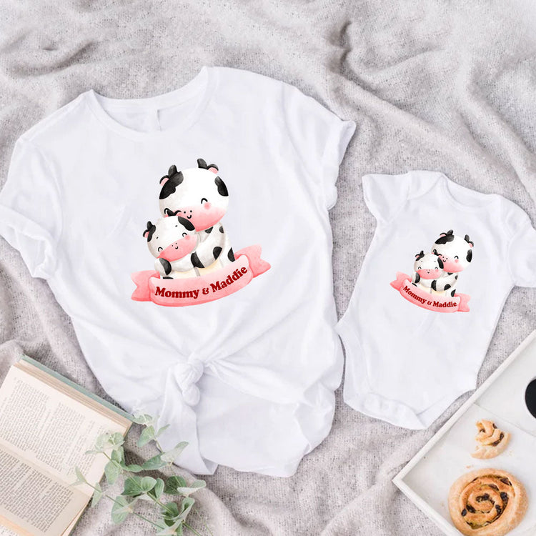 Cute Cow Matching Outfit For Mom And Baby Custom Name In First Mothers Day, Cow Matching Outfit For New Mom New Baby