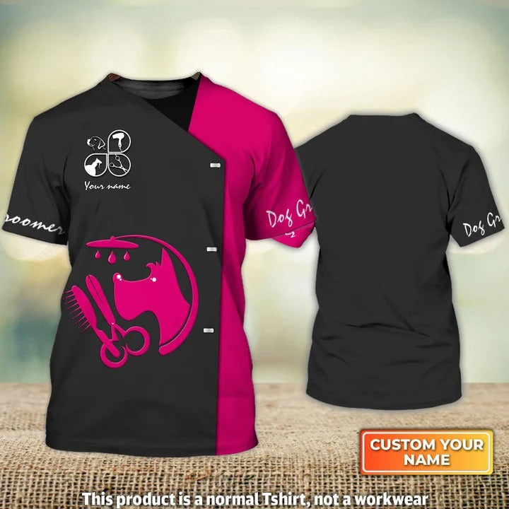 Dog Groomer Pet Groomer Uniform Black Pink Personalized Name 3D Tshirt