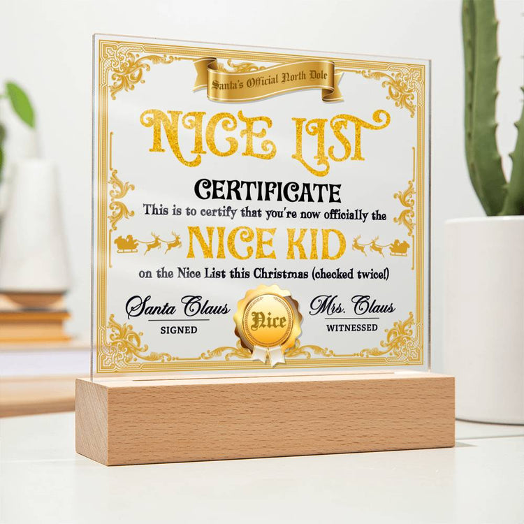 Nice List Certificate Acrylic Gift | Acrylic Plaque | Night Light