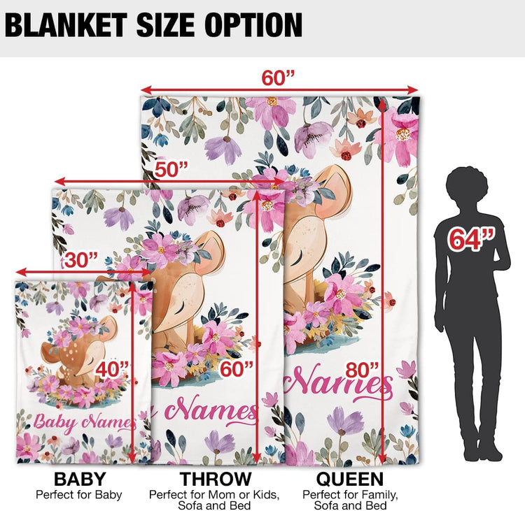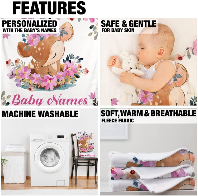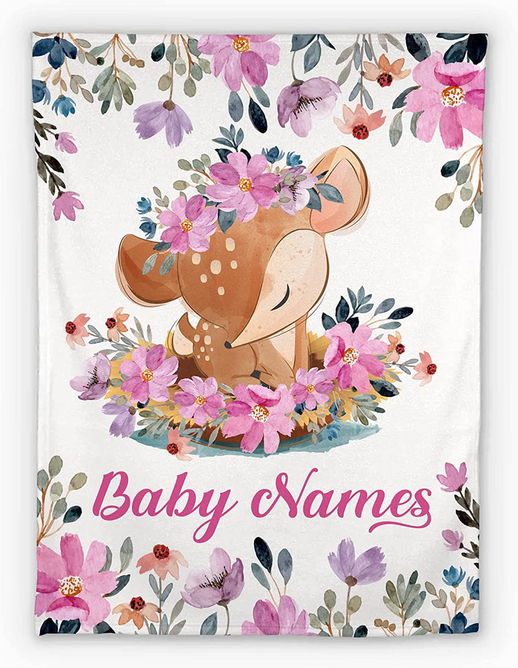 Personalized Baby Girl Blankets, Customize Baby Girl Blanket with Names - Cute Woodland Fawn Deer Baby Blanket Girl with Custom Name