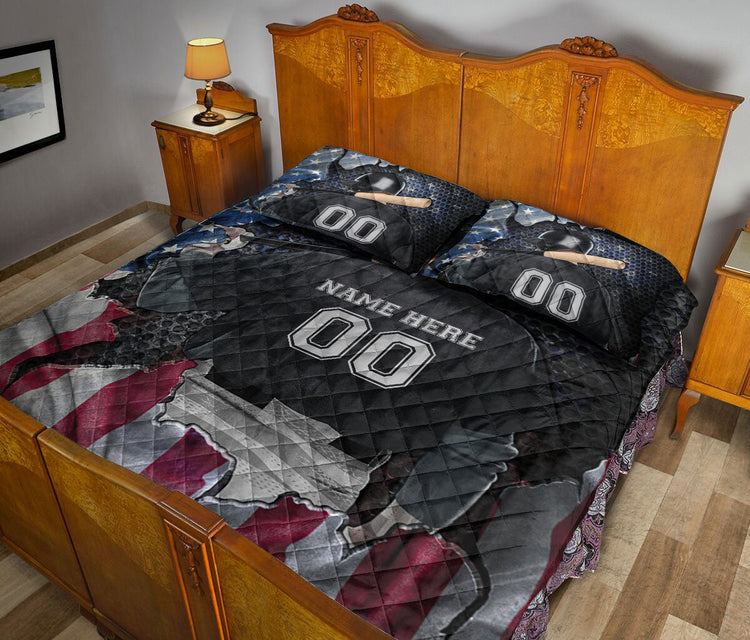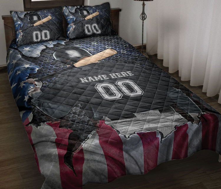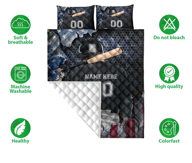 Personalized Baseball Quilt Set, Baseball Boy Us Flag Quilt Blanket With Pillowcases, Custom Name and Number Quilt Bedding Set, Sports Gifts
