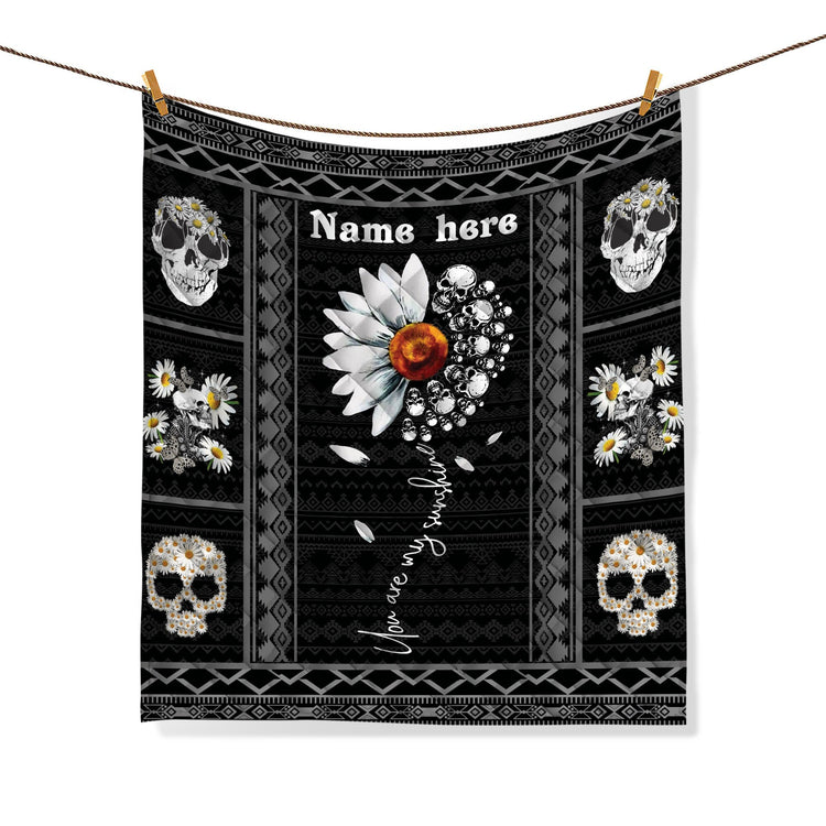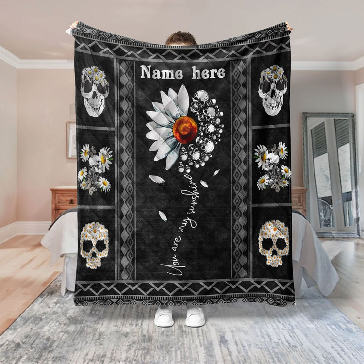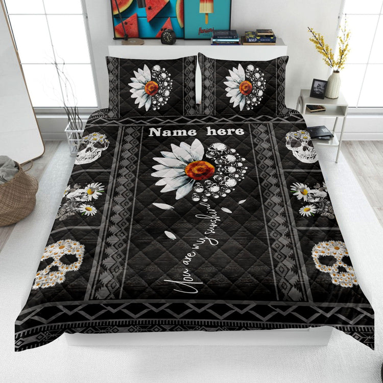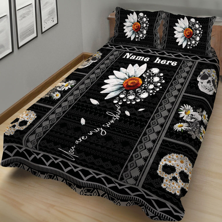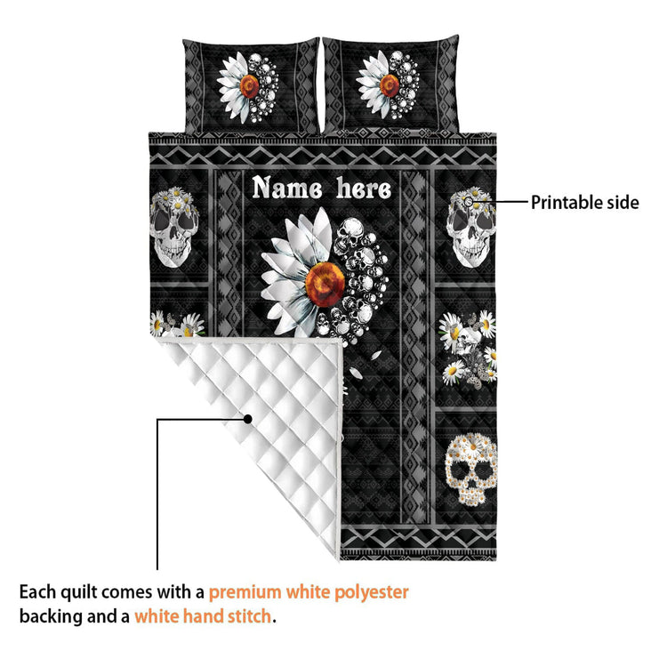 Personalized Duvet Cover Skull Quilt Set, Skull Daisy Quilt Blanket & Pillowcase, Custom Name Quilt Bedding Set, Skull Bedspread, Gift for Skull Lover