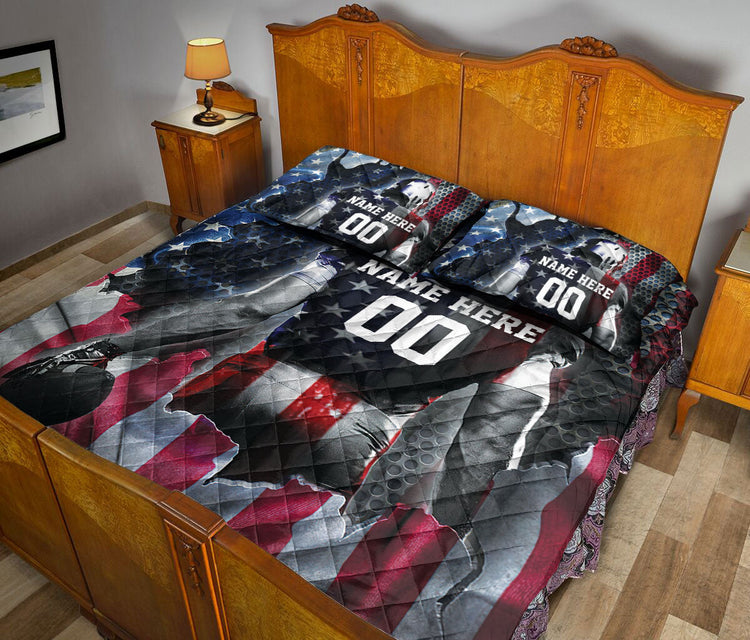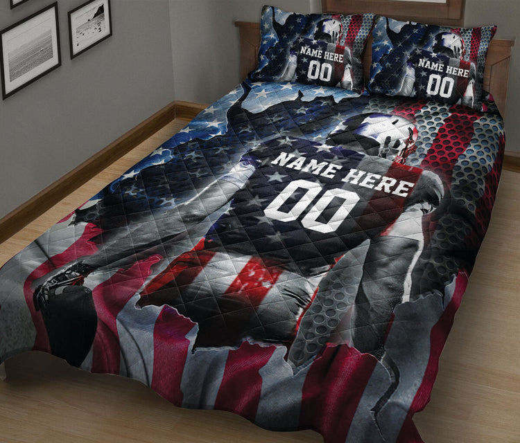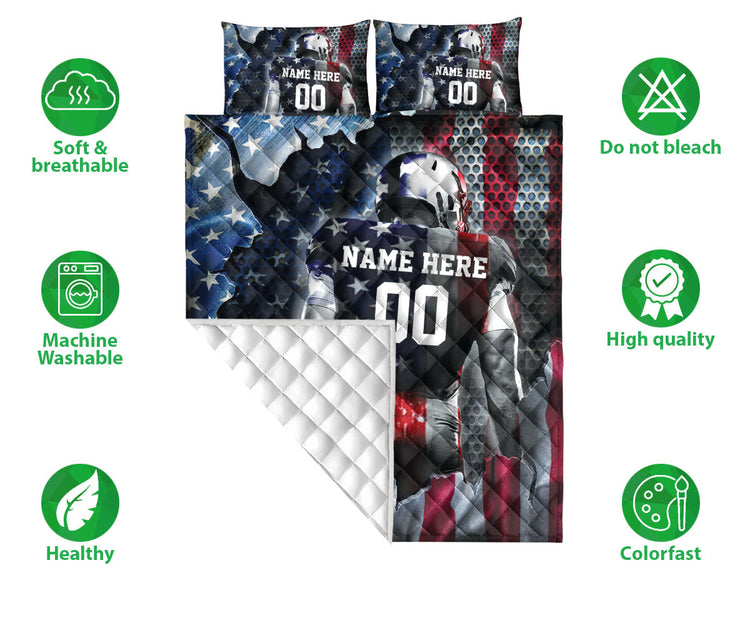 Personalized Football Quilt Set, American Football Player Us Flag Quilt Blanket With Pillowcases, Quilt Bedding Set