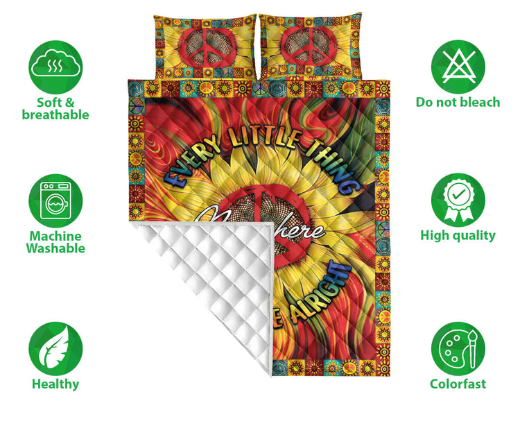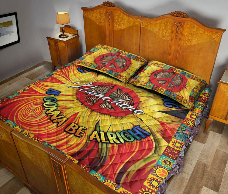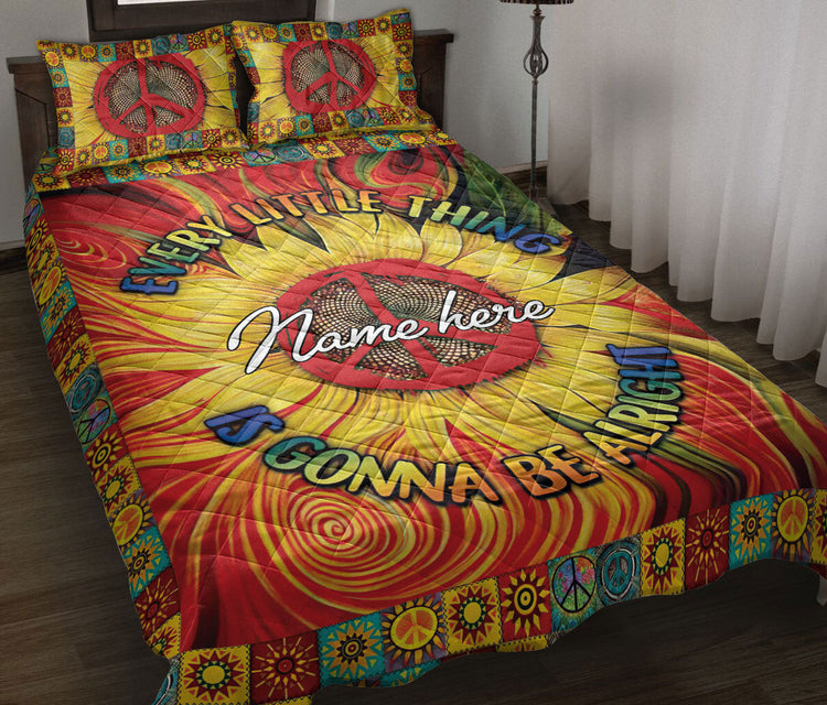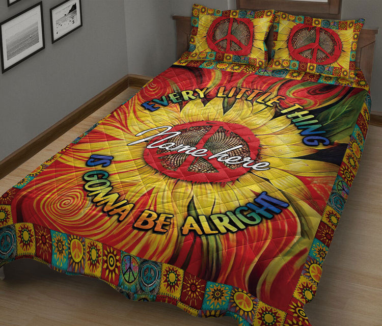 Personalized Hippie Quilt Set, Sunflower Peace Sign Hippie Trippy Quilt Blanket With Pillowcases, Custom Name Quilt Bedding Set