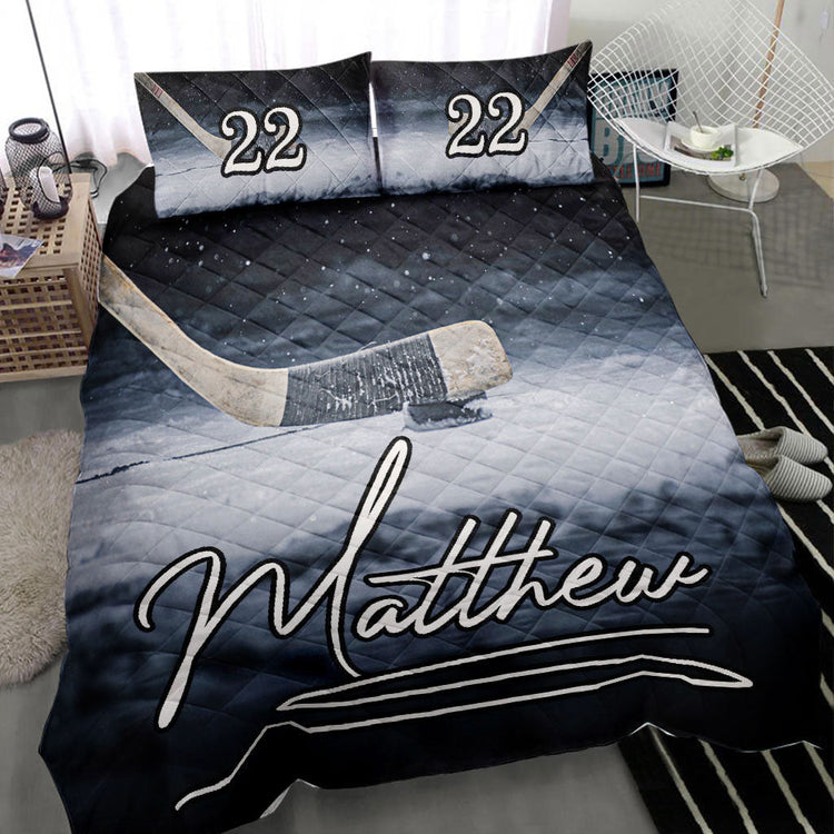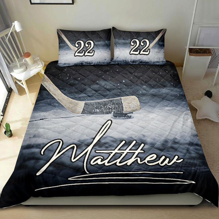 Personalized Hockey Quilt Set, Ice Hockey Stick And Puck Quilt Blanket With Pillowcases, Custom Name and Number Quilt Bedding Set